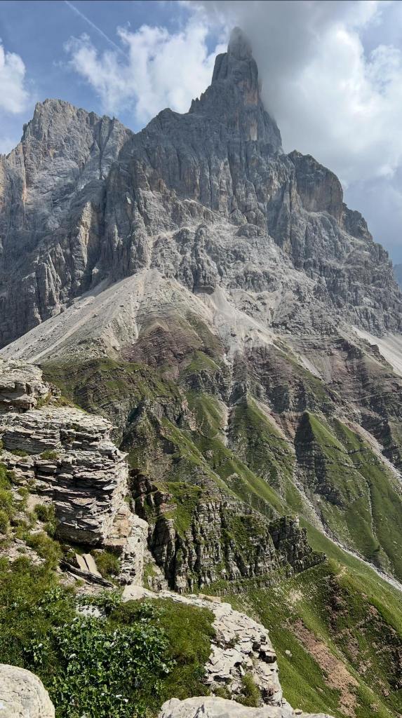 Rifugio Mulaz: Vi vandrar i eit postkortmotiv i grønne omgivelsar, og i neste øyeblikk går vi opp langs dei kvite ikoniske fjella som er sjølve Dolomittane! Rutevalg ikkje bestemt. Medium vanskelegsgrad.